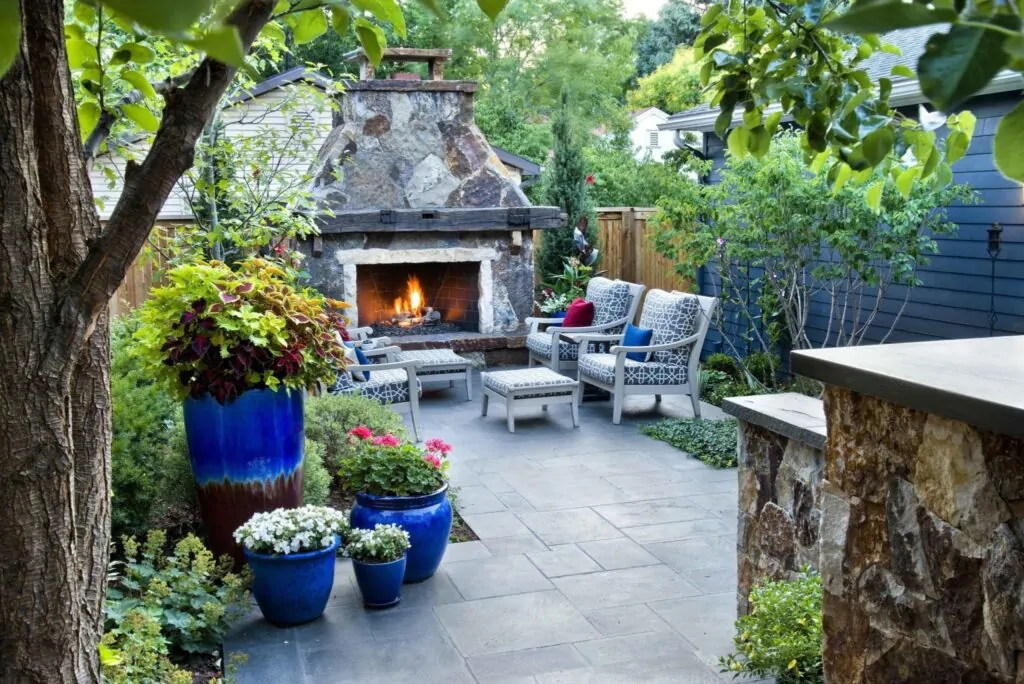 If you’re worried your outdoor conditions might be less than favorable, create a oasis with climate control, sound masking, privacy, and organics. Outdoor fans can keep temperatures from climbing in the summer and a cool breeze blowing. A heater or custom fireplace incorporated into your hardscape can be stylish as well as cozy. A sound system that plays relaxing music or a bubbling water feature can mask the sound of passing cars or noisy neighbors. Surrounding your outdoor room with sound masking plants like climbing vines or a pocket garden can keep your space private and full of natural inspiration.